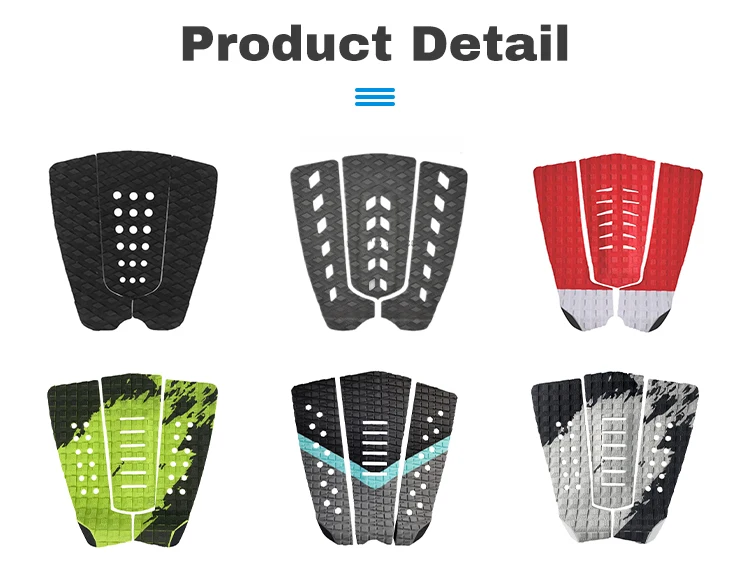 OverviewProduct TypeSurfboard AccessoriesMaterialHigh density environmentally friendly EVASize15.7x14.2 inchesPad Construction2-piece, 3-piece, 4-pieces, 5-piecePad Thickness3mm, 5mm, 7mm, customizedCenter ArchFlat, middle archGroove patternCorduroy, diamond, square, mixed, customizedAdhesiveHigh-grade 3M adhesiveLogoNo logoColorAll black